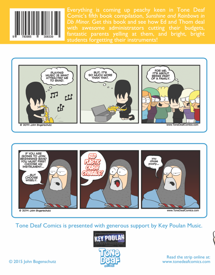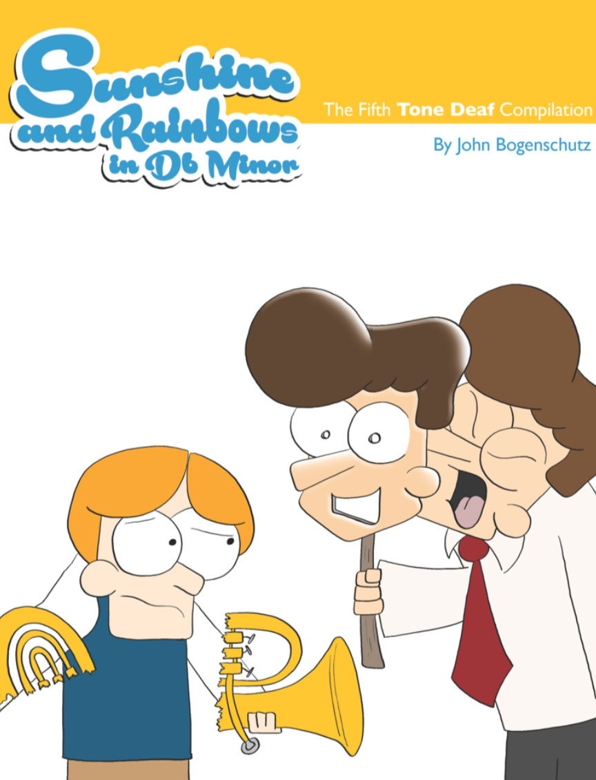 Everything is coming up peachy keen in Tone Deaf Comic's fifth book compilation, Sunshine and Rainbows in Db Minor. Get this book and see how Ed and Thom deal with awesome administrators cutting their budgets, fantastic parents yelling at them, and bright, bright students forgetting their instruments. This book comes with 102 pages full of comics in full color! Add it to your collection today!