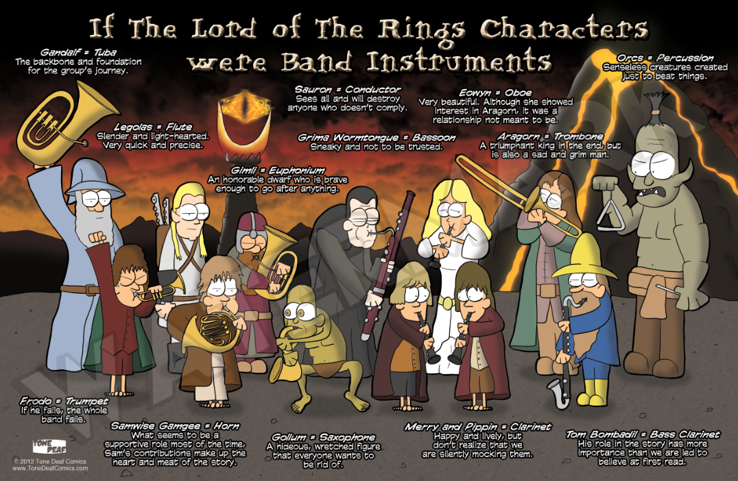 'If the Lord of the Rings Characters were Band Instruments' poster is the perfect accent to your band office or band room (or dungeon room in Mordor).